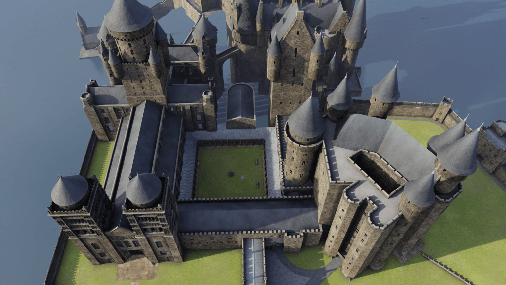 Gloucester is also kiiiinda 2-story height-wise, so that is also a good fit, but looking at the shot, the second story of the portico/cloister on the model seems to be mainly solid wall, which isn’t the case with Gloucester – though obviously the paving and green doesn’t match the actual Gloucester courtyard’s regardless. My assumption is that that the Gloucester reference is for the upper windows near the top of the Quad, also visible in the overhead shot, which do seem a lot more Gloucester-style.
