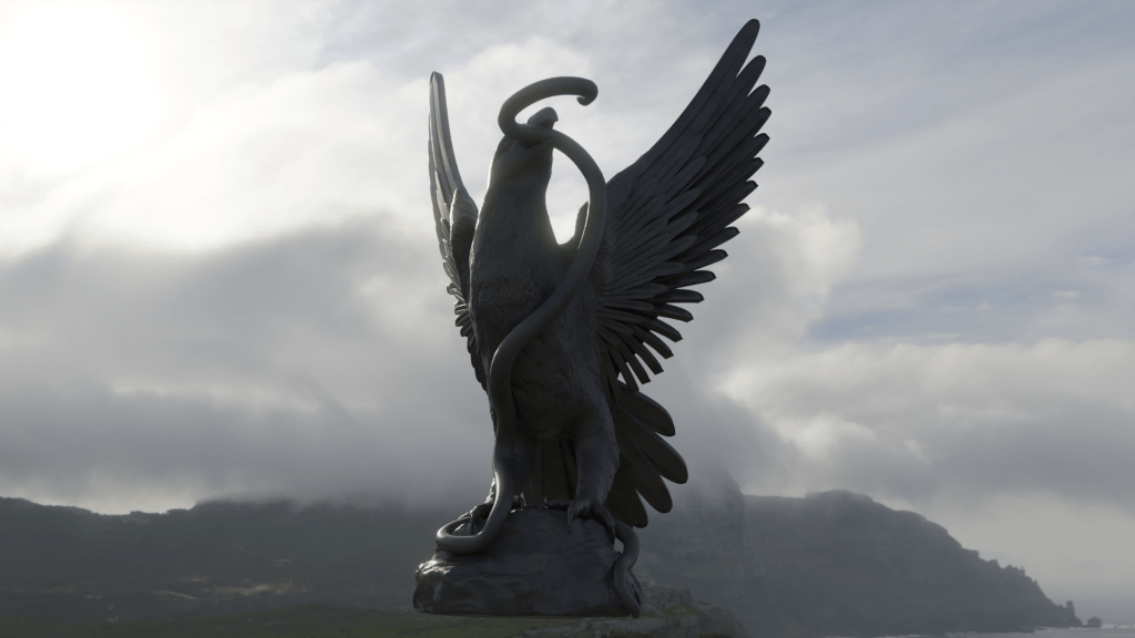 The snake’s head was sculpted separately with its jaws already fully open…no need to worry about rigging and posing this fella. Good reference is scant for the head; as with the eagle, I relied on photos of real animals to help me fill in the gaps, but it was surprisingly hard to get a good “likeness.” Oh well…at least I planned out the retopology a little better than with the eagle. That enabled me to graft the head onto the body and bake a normal map from the head sculpt. He still looks kinda funky without fangs, but they appear to have been weathered away in the film.