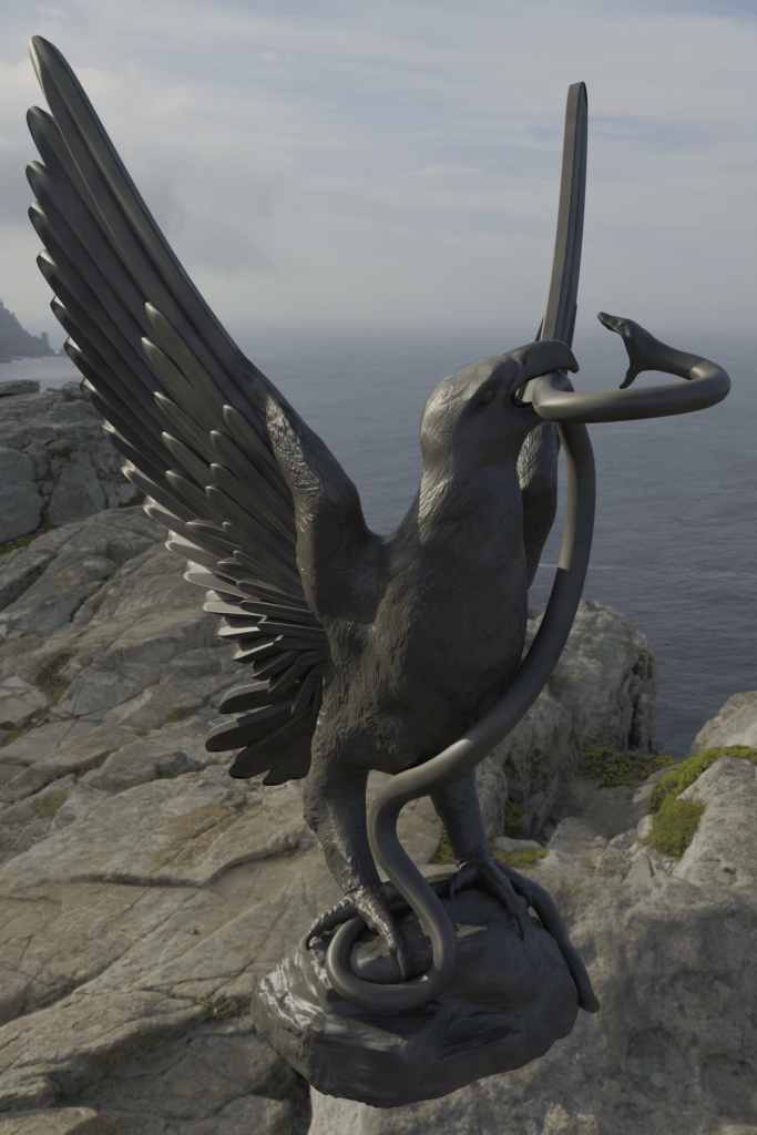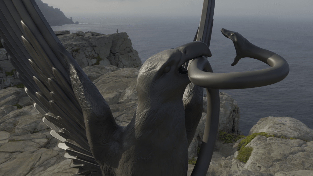 First up – finishing the statues. I believe the original Mexican symbology has the golden eagle perched on a prickly pear cactus, but the base of this statue appears to be a nondescript rock, and that’s what I’ve modeled it after. It was fun to glob that together with Blender’s “clay strips” sculpting brush; I also rigged and posed the eagle’s mouth and claws to hold the rattlesnake, whose body started as a squiggly Bezier curve with a circular cross-section. I enjoyed trying to match the sinuous, energetic gesture of the original.