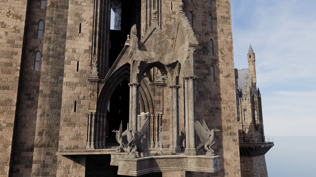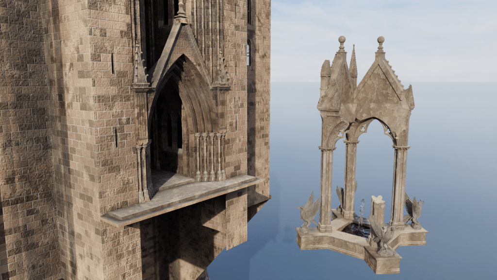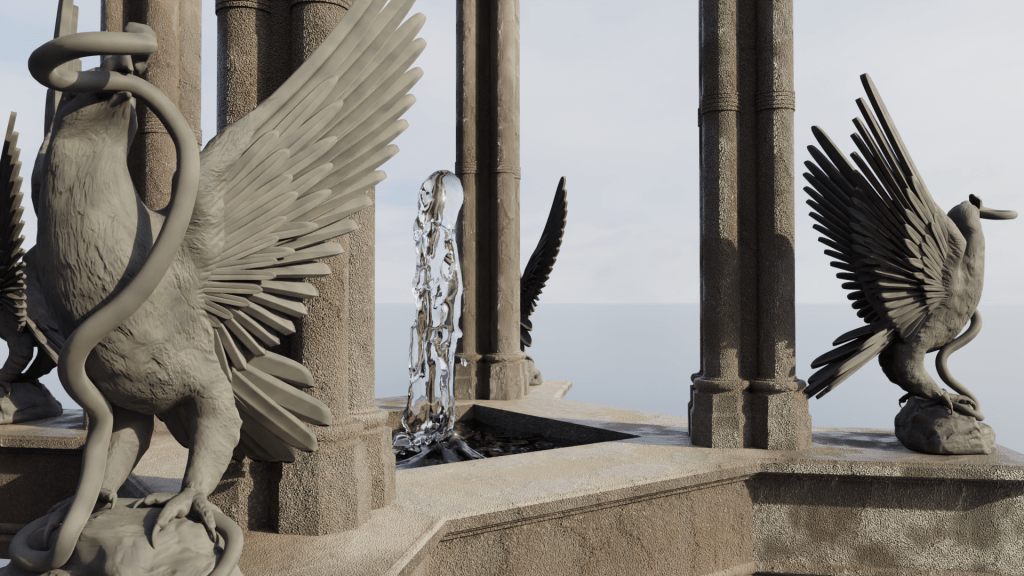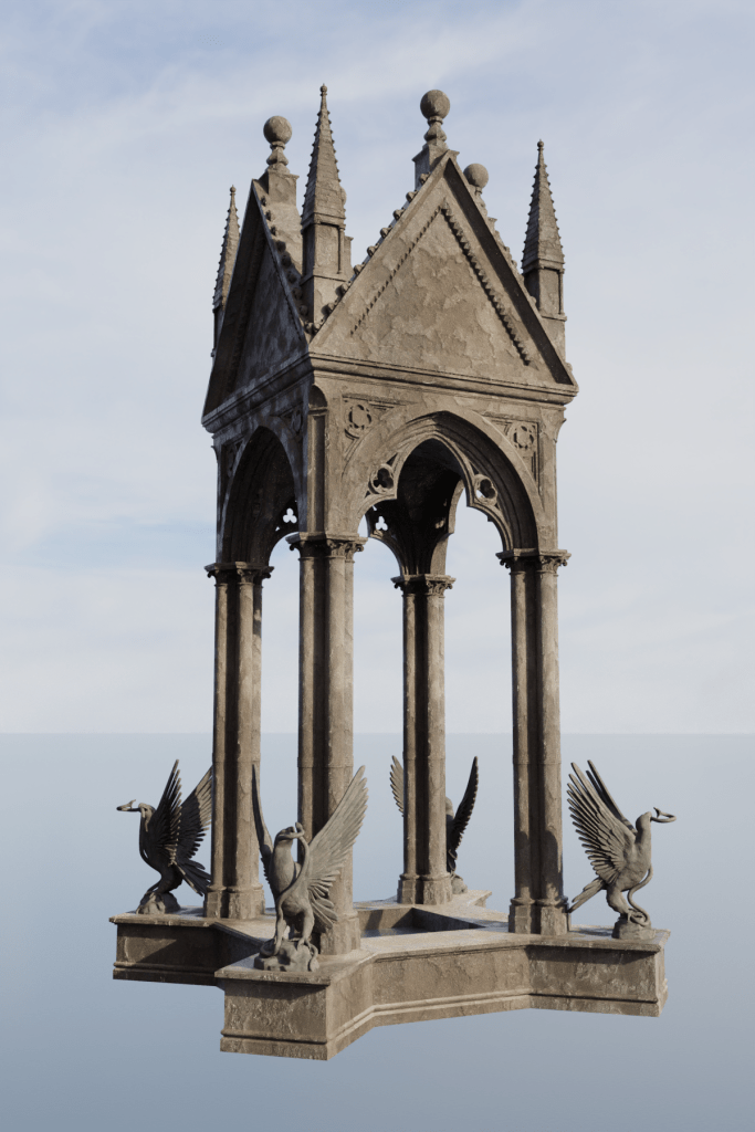 Integrating this into the main model ended up being very easy. There are four statues: one at each corner of the fountain. As I placed these, I spotted some angles and proportions that were a little off, but I suppose that’s the downside to working on the statue in its own file. Oh well. The complete fountain still looks pretty cool!